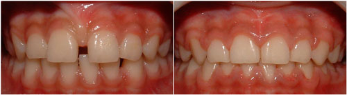 检查:门牙缺缝较大,影响发音,下前牙也有稍小的缝隙,X片显示根尖无异常。